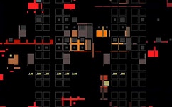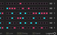 If a track is active, a red dot moves horizontally through it. Each time this dot hits a coloured square set by one of the performers, a sound is triggered by the audio engine. Each performer has their own colour, making it possible for the audience to follow who is doing what. The movement of the scanning dot can be quite complex: each track can have its own direction, offset, speed, and length, providing a simple yet highly effective way to create constantly permutating musical structures.