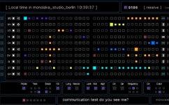 Following the successful first performance at the MUTEK festival in Montreal in 2002 with me in Berlin and Scott on stage in Montreal, the software was refined and revised multiple times. This allowed for more complex interactions, incorporated a more advanced chat function, and — resulting from a programming error that turned into a feature — introduced a glitch-based destruction of the interface during the performance, synchronised with an equally glitchy deconstruction of the sound.